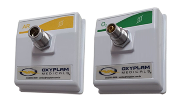 Instalados nas cabeceiras dos leitos, as canoplas são pontos de consumo confeccionados em plástico de alta resistência, fabricados nas roscas padrão dos fluídos e dotadas de válvulas de fechamento por impacto. Os pontos são identificados por etiquetas em policarbonato, com impressão em pintura especial embutida entre a película e os adesivos que evitam o desgaste da impressão.